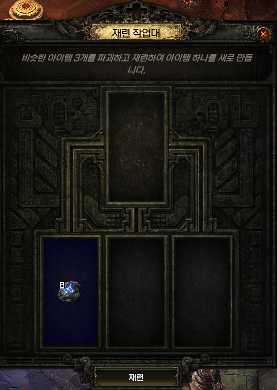 재련 작업대는 동일한 등급(일반/마법/희귀)의 아이템을 넣으면 상위 재료로 변경해 줍니다.