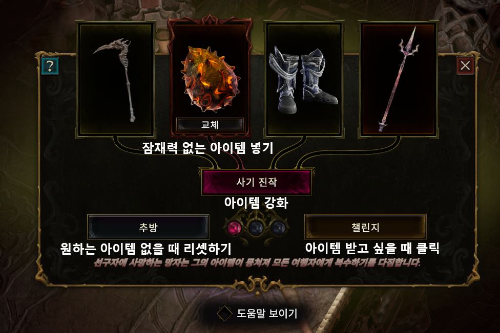 아이템을 강화합니다. 항상 모든 아이템이 강화되지 않으며 4개 중 일부만 강화되기도 합니다 - 추방
