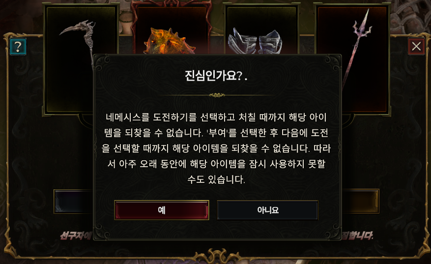 아이템을 받고 싶을 때 선택. 네메시스와의 전투에서 승리하면 아이템을 받습니다.