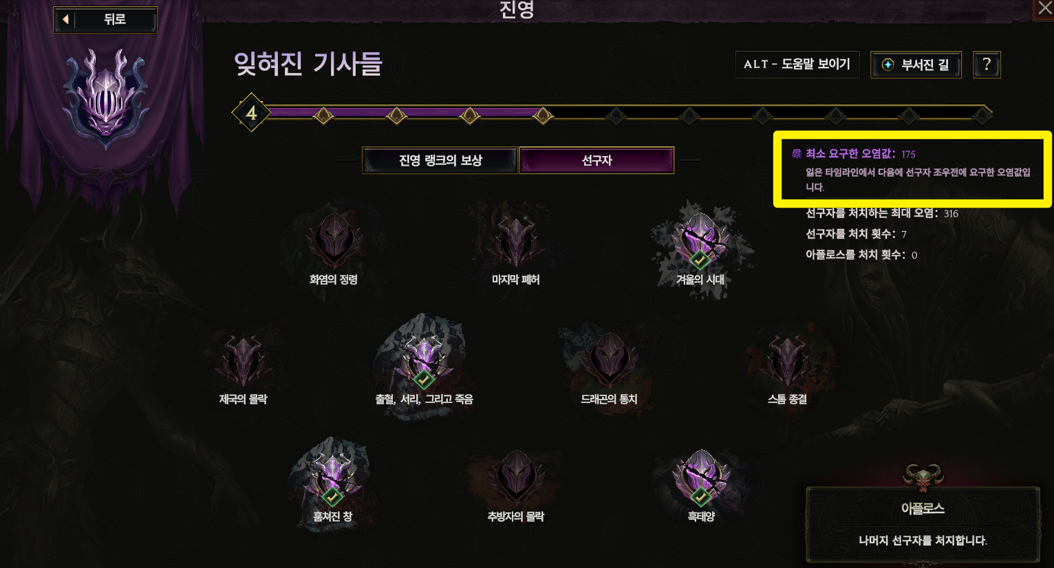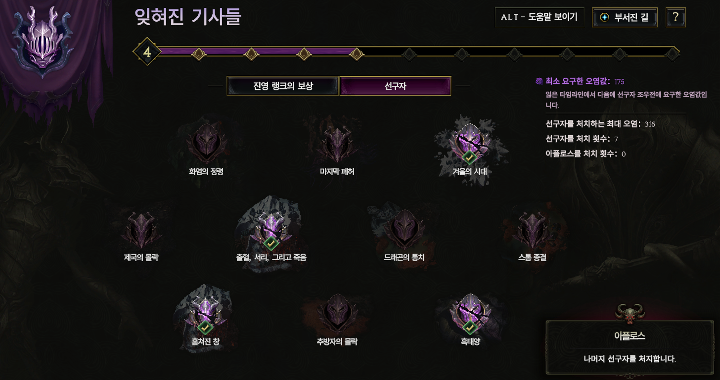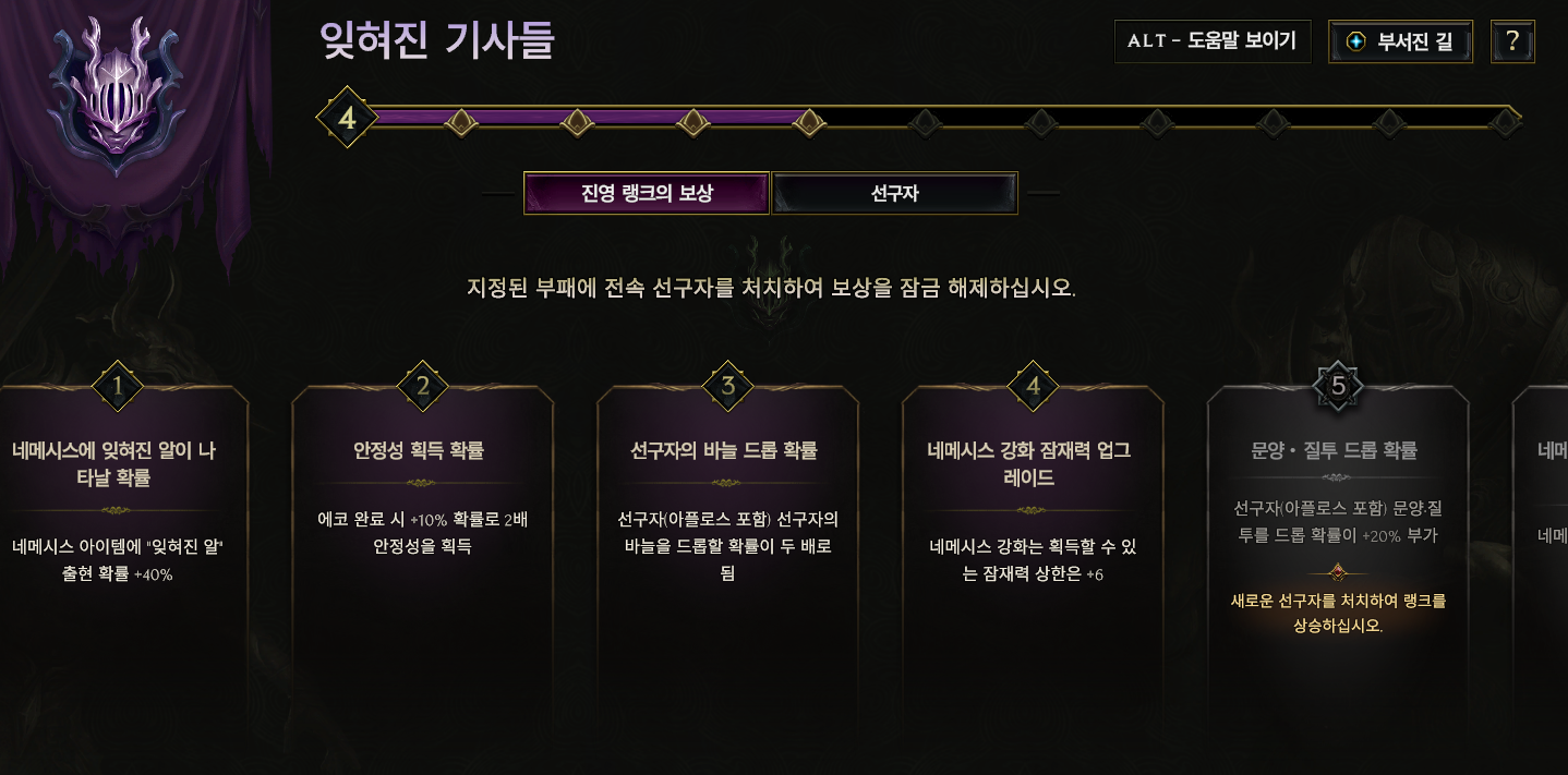 지역 보스를 처치하면 선구자가 등장하고 모두 처치하면 잊혀진 기사들 랭크가 오릅니다.