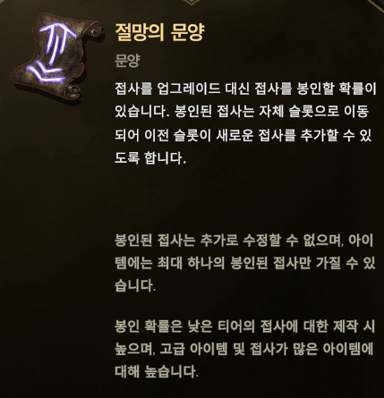 2) 절망의 문양을 사용해서 옵션을 봉인할 수 있으며 티어가 낮을 수록 쉽게 성공합니다.