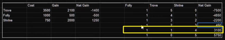 회랑(Folly) 1개, 보물지(Trove) 1개, 신전(Shrine) 4개로 배치하는 것이 효율적이라는걸 알 수 있습니다.