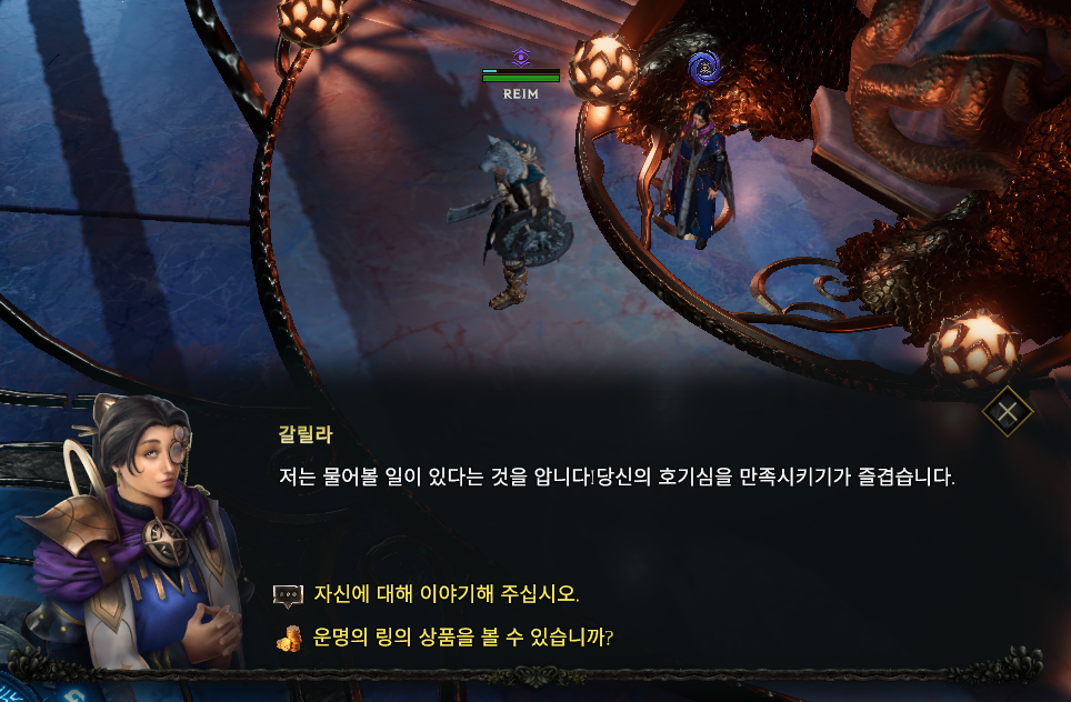 갈릴라와 대화를 통해 진영에 가입할 수 있고 렌즈라는 아이템을 구입할 수 있습니다.