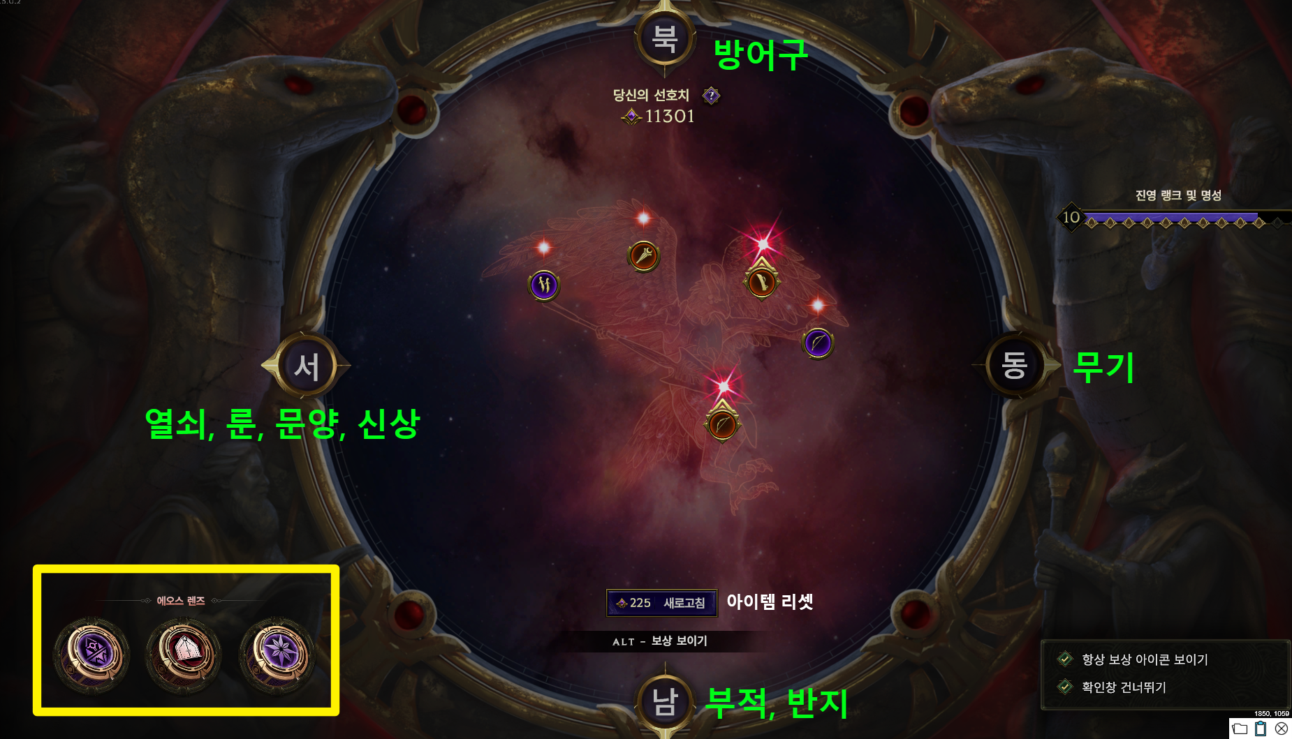 렌즈는 진영 레벨에 따라 최대 3개까지 장착 가능합니다. 아래 3종의 렌즈를 추천합니다