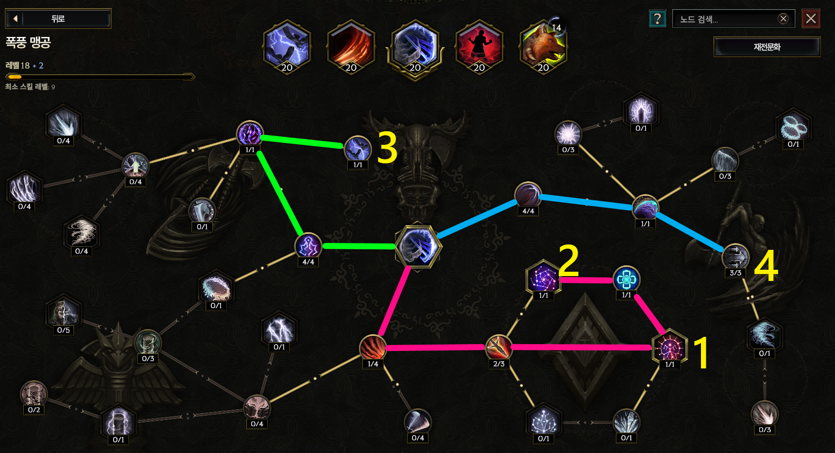 마나 소모를 위해 1, 2번 노드에 투자하면 폭풍 맹공을 부담없이