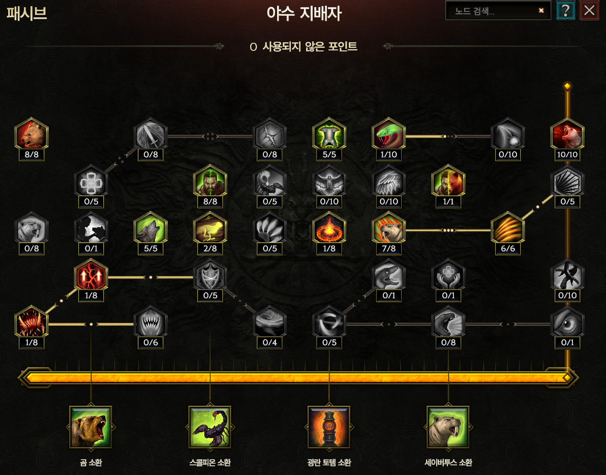 최대 동반자 수+1을 활성화해서 폭풍까마귀를 한마리 더 소환하기 위해 길들인 사냥꾼까지 6포인트만 투자하고 나머지 포인트는 투자하지 않는다. 액션바에도 넣을 필요가 없고 대신 이동기로 분노의 도약을 넣어 사용한다.