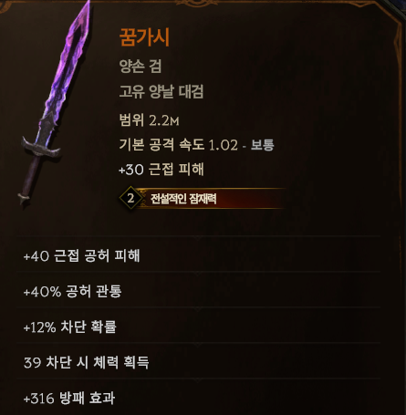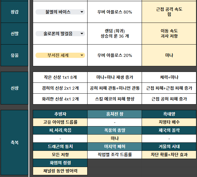 양손 무기 : 로렌트의 망치 (1렙) → 꿈가시 (15렙) → 그림자의 비콘 (51렙) 추천