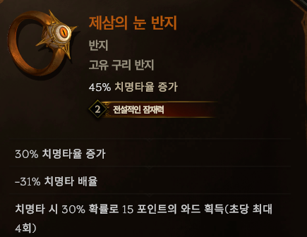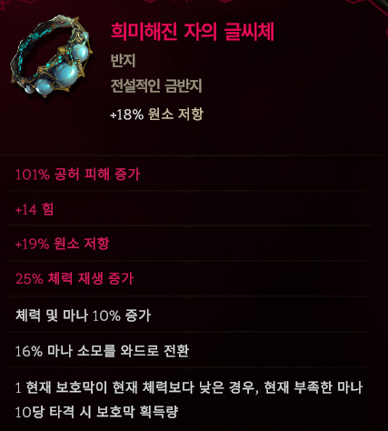 반지 : 퀵실버 (12렙) / 제 삼의 눈 (14렙) / 희미해진 자의 글씨체 (15렙) 중에서 선택