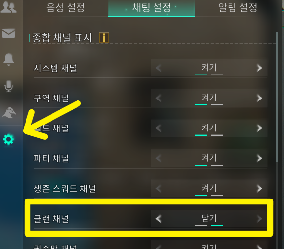 엔터 - 왼쪽 설정 아이콘 - 클랜 채널 : 닫기로 설정하고