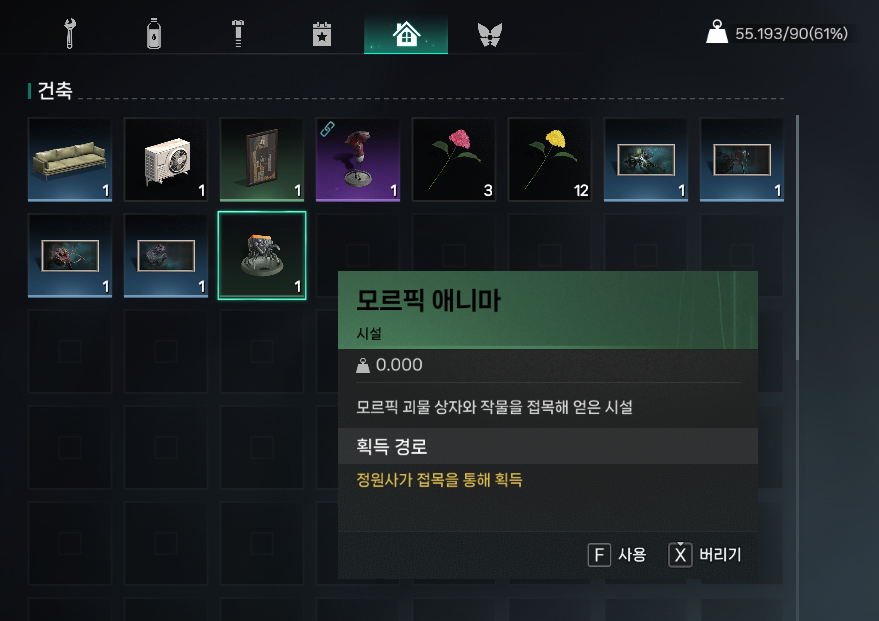 이렇게 완성된 모르픽 애니마는 L키를 눌러 가방에 수납하면 가구 카테고리에 들어갑니다.