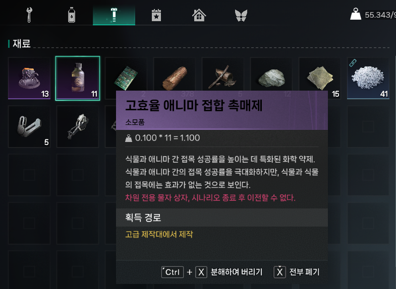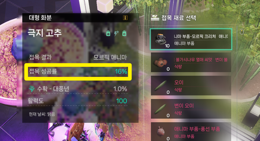 식물이 100%로 성장하면 접목이라는 메뉴가 보이는데 이때 모르픽 크리쳐 애니마 부품을 접목 시킬 수 있습니다.
