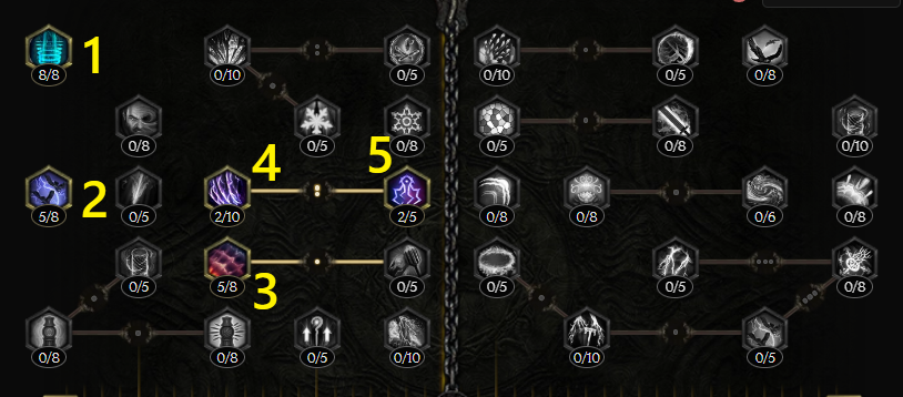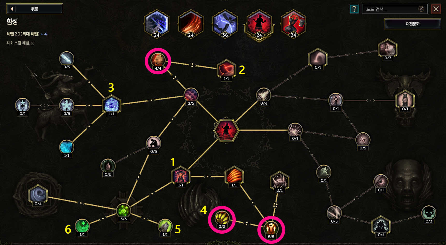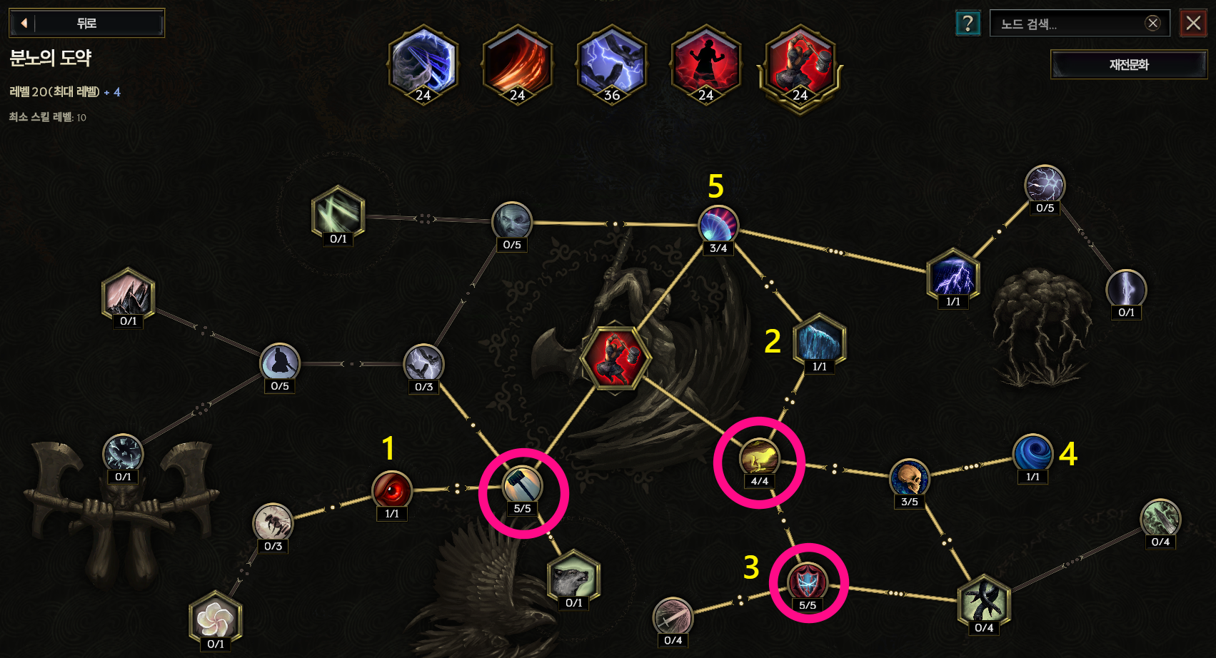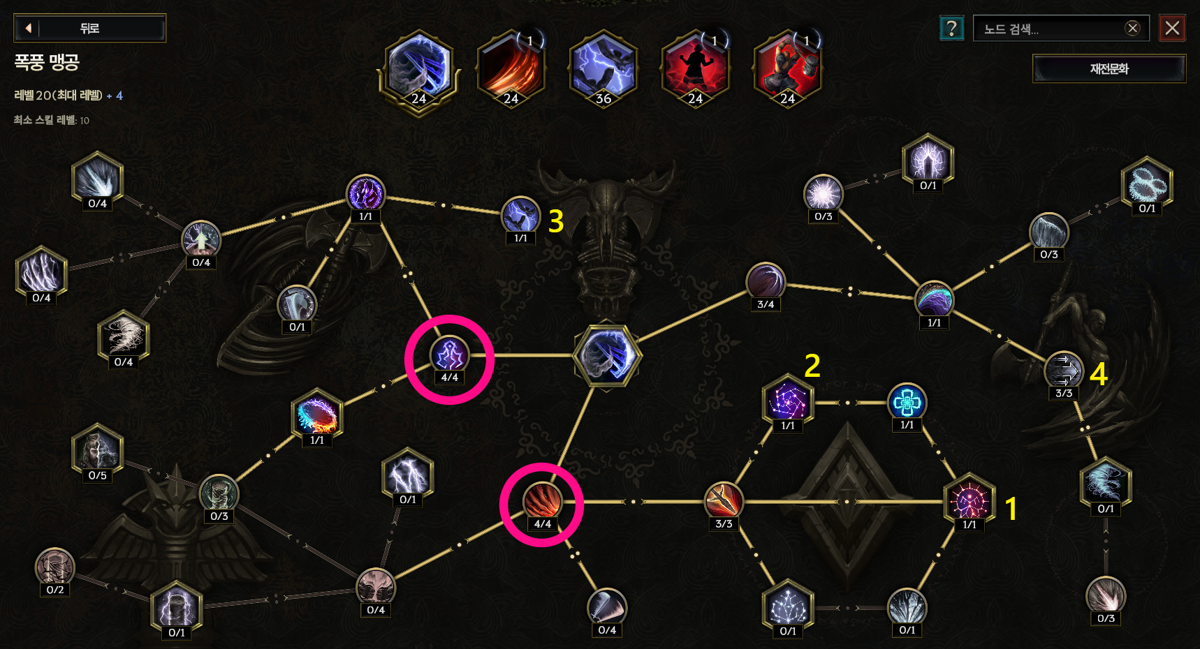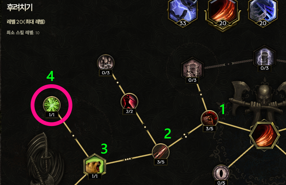 - 까마귀 폭풍을 최대한 빠르게 두번 사용하기 위해서 가장 먼저 1번 노드에 투자합니다. (대략 18렙에 가능)