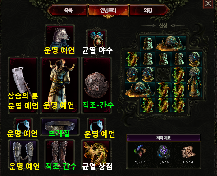 선호치 모이는대로 반지 예언부터 구입하는걸 추천합니다 - 그 외에 헬멧, 갑옷, 장갑 순서대로 예언 구입해서 파밍했습니다.