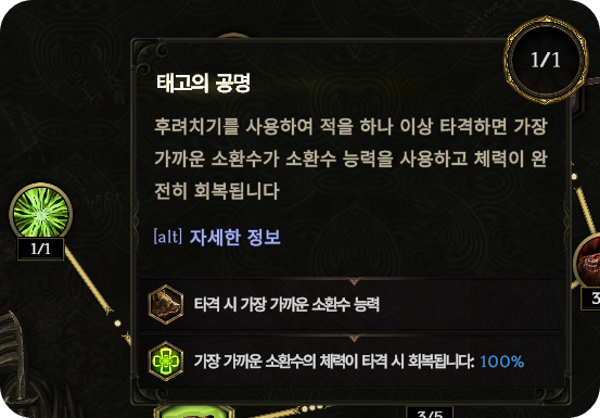 - 가시 토템이나 다른 스킬을 넣고 활용할 수 도 있지만 태고의 공명을 빠르게 투자해