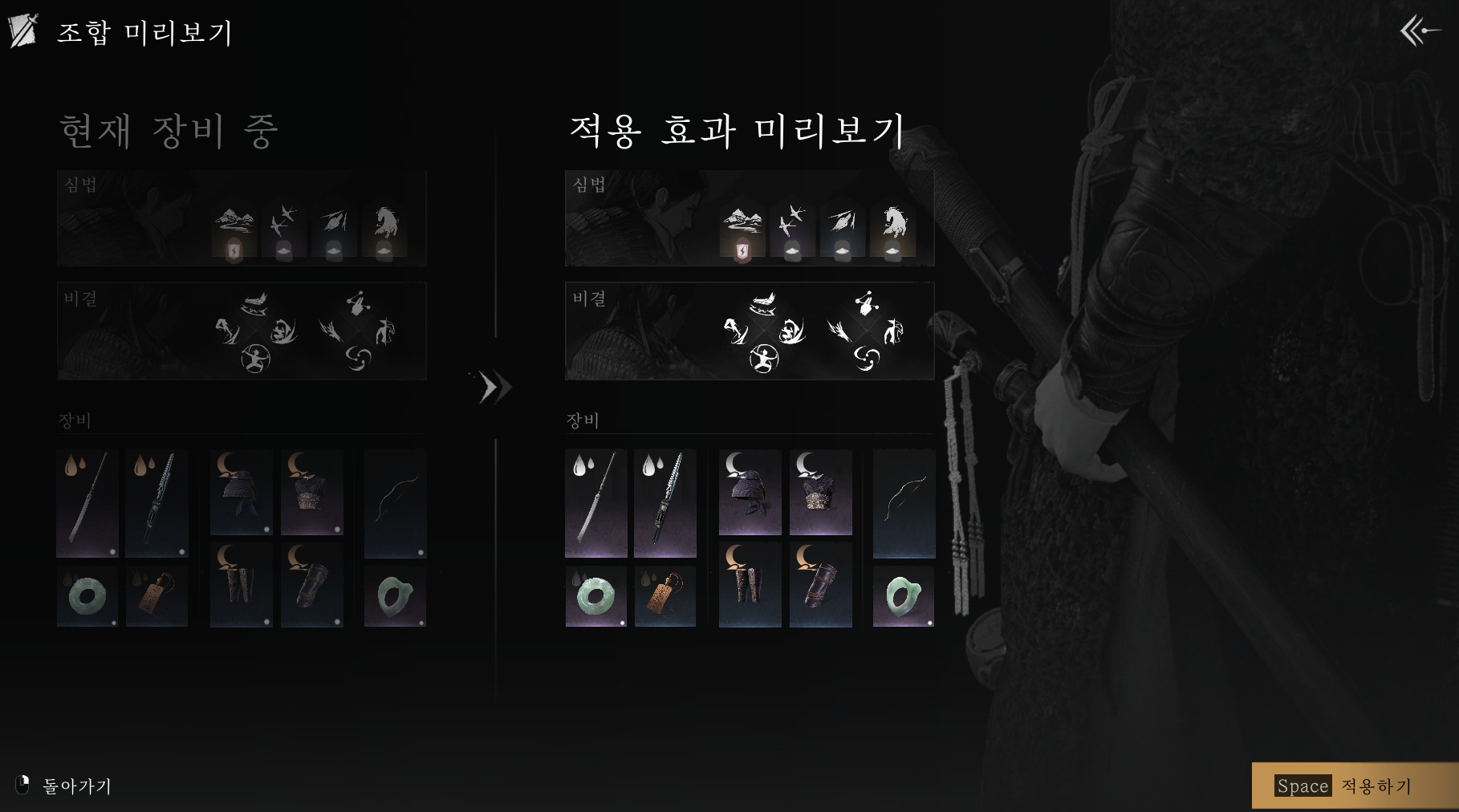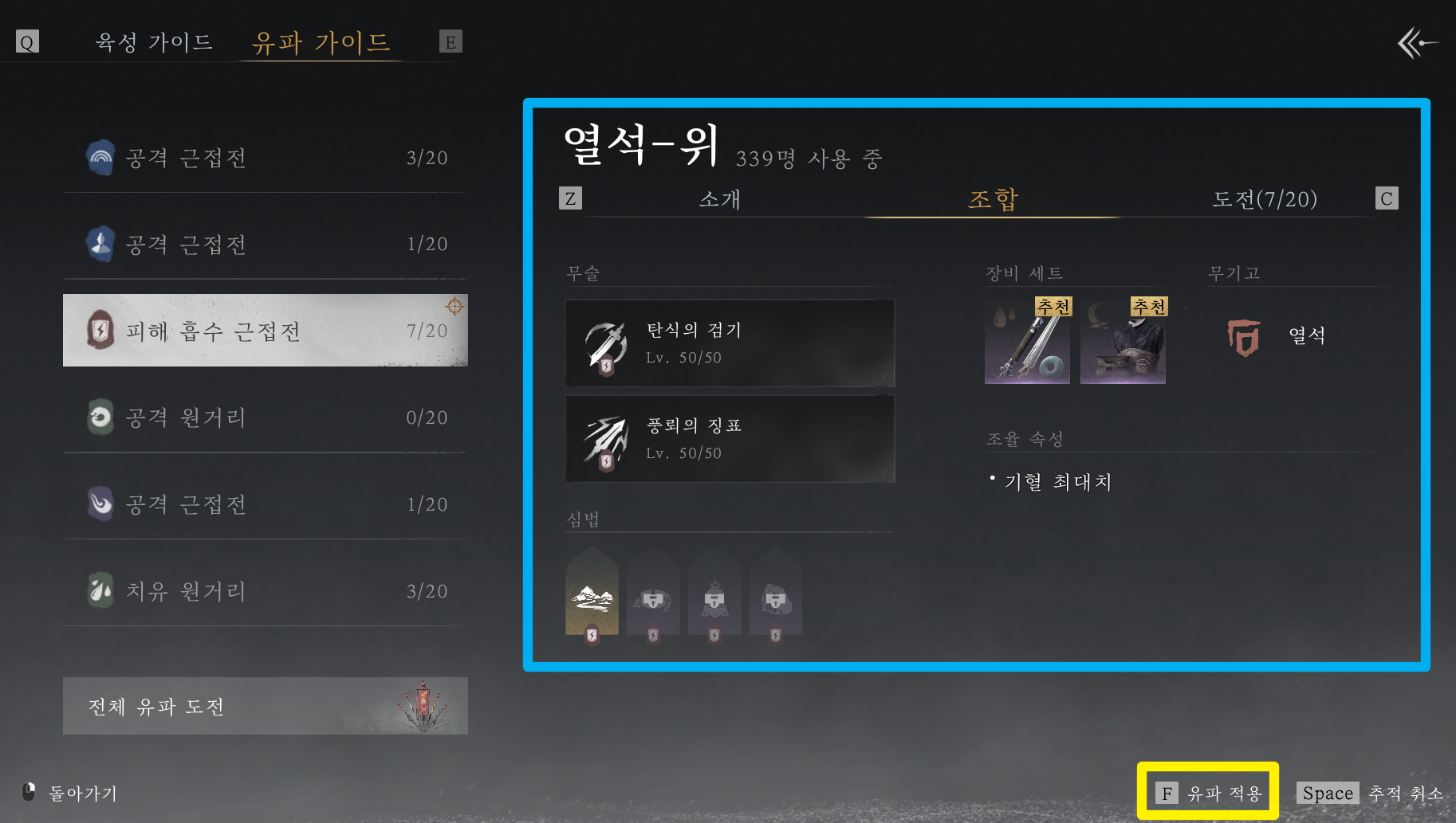 특히 유파 적용 버튼을 누르면 자동으로 세트 효과에 맞춰서 장비를 착용해주기 때문에 매우 편리합니다