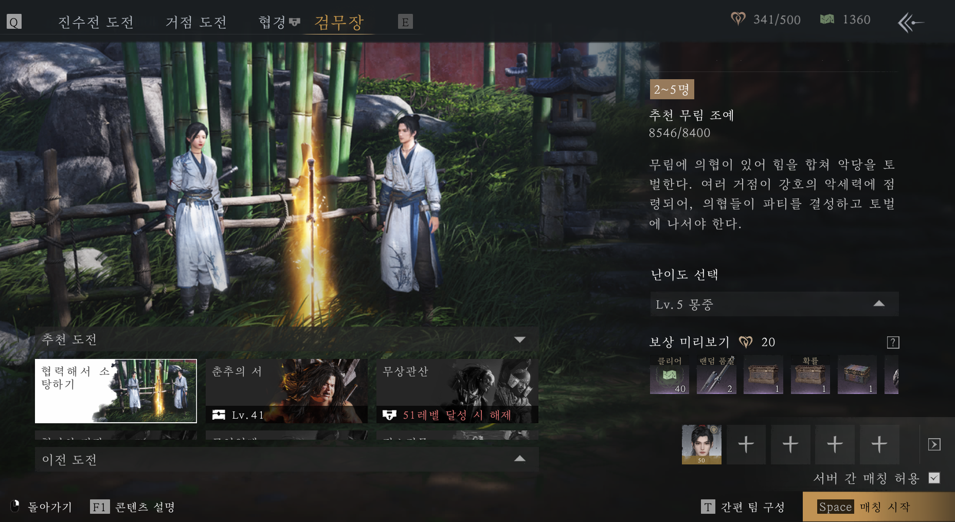 ESC - 강호행 - 도전 - 검무장에서는 파티 매칭을 통해 던전을 클리어하고 보상을 받을 수 있습니다