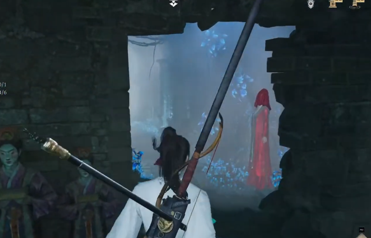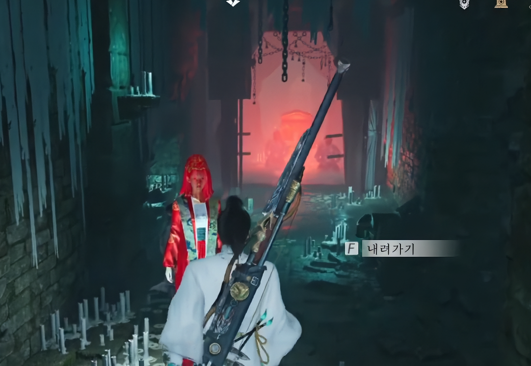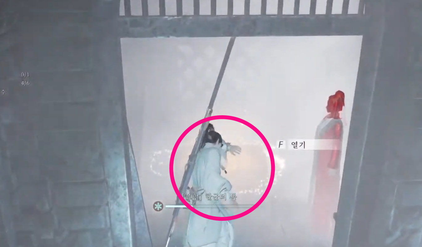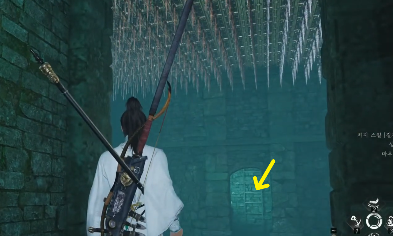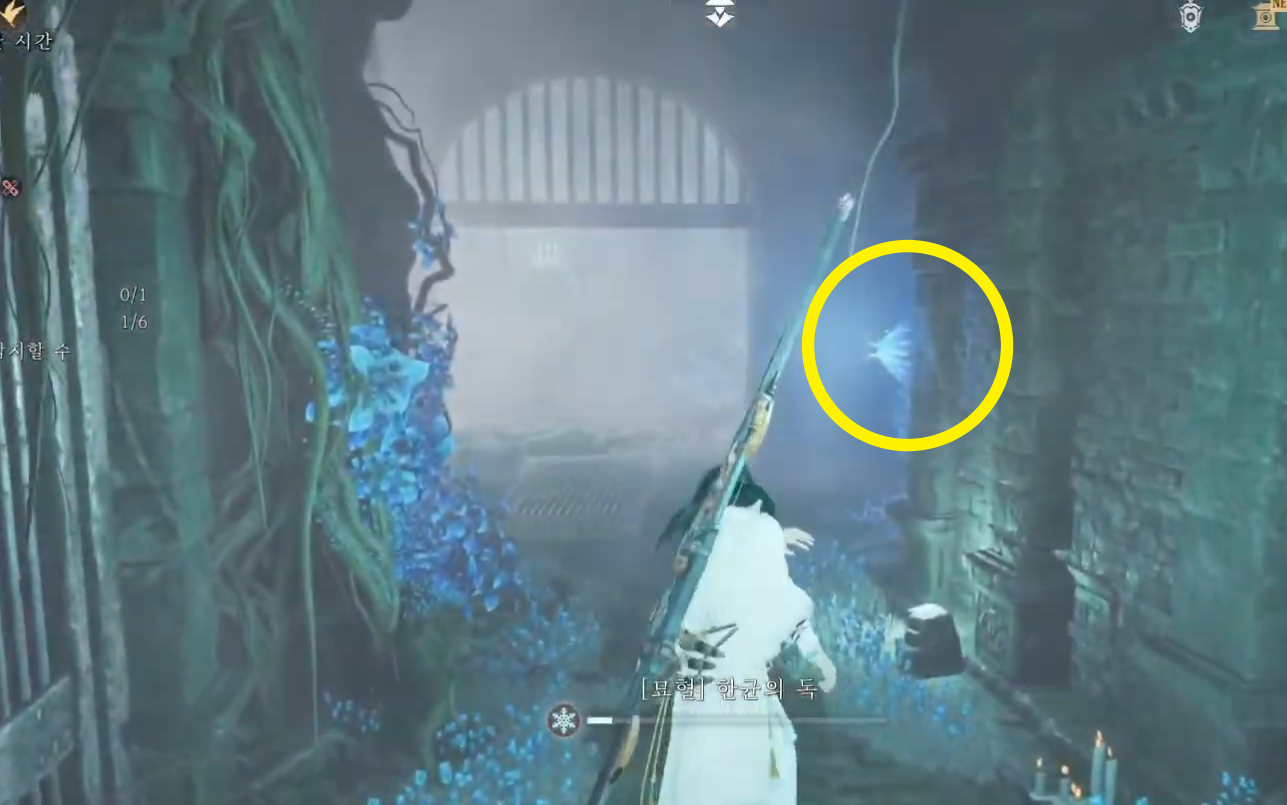 감옥 통로에 진입하면 한균의 독 게이지가 차기 시작하지만 무시하고 끝까지 간 후 첫 번째 꽃봉우리를 불화살로 처리합니다