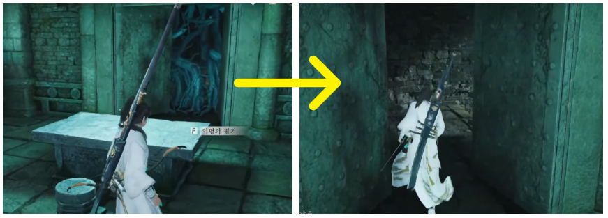 한번 더 밑으로 내려가는 통로를 지나 처음 방으로 나가기 직전, 오른쪽에 있는 세번째 꽃봉오리를 불화살로 쏴야합니다