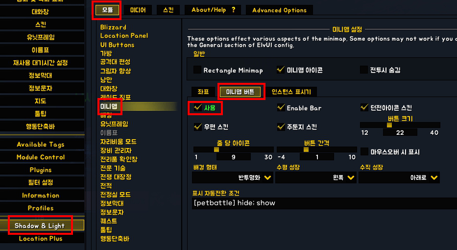 >> 미니맵 사각형 아이콘이 안보일때는 "MBB 아이콘" 체크 해제