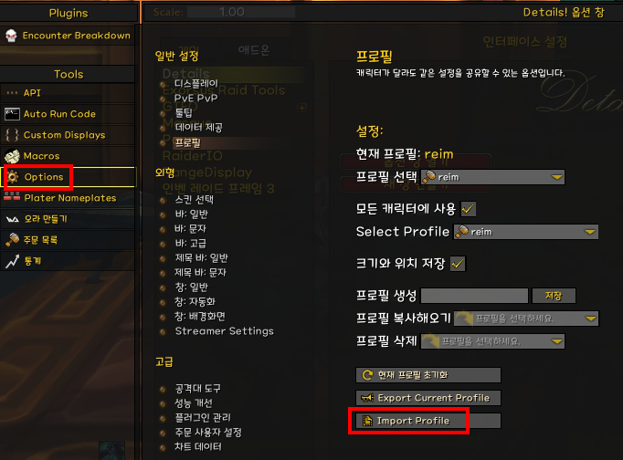 Import Profile에 아래 코드를 붙여넣기