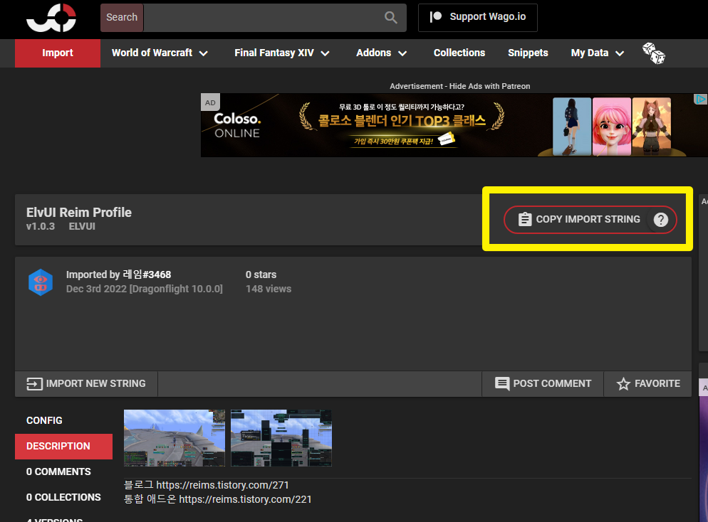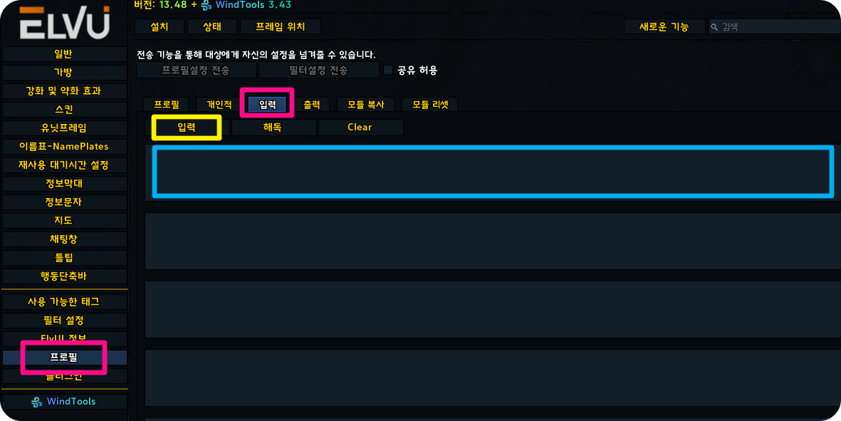 2. 인게임에서 ESC > ElvUI > 프로필 > 입력 아래 빈칸에 문자열을 붙여넣기 하세요.