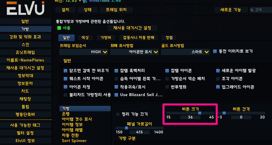 통합애드온은 ElvUI 가방으로 세팅되어 있습니다.