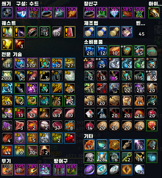 (필터 기능을 사용하려면 ElvUI Bag Filters 애드온을 추가로 설치해야 합니다.) - 깔끔하고 신규 아이템은 상단부터 채워지기 때문에 구분하기 쉽습니다.