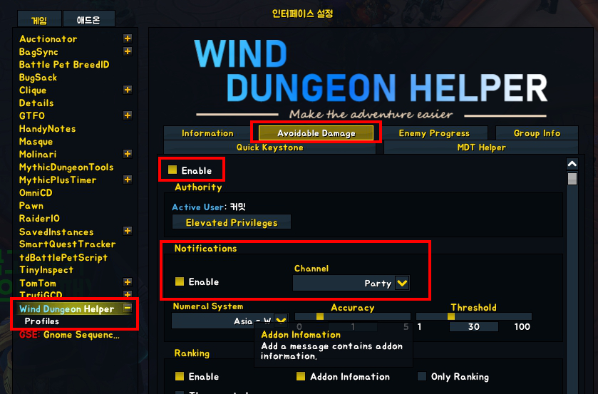 애드온 찾기에서 "Wind Dungeon Helper(WDH)"으로 검색