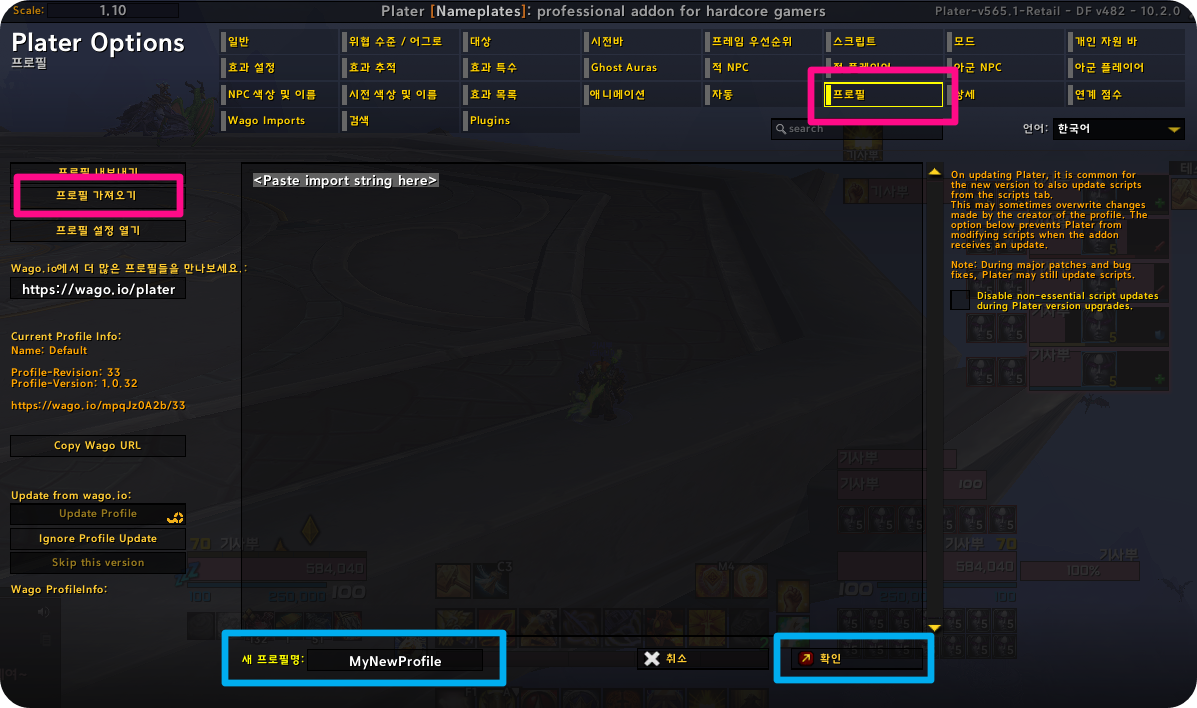 통합애드온에 포함되어 있지만 Plater만 사용하고 싶은 분들은 wago에서 프로필을 import 할 수 있습니다.