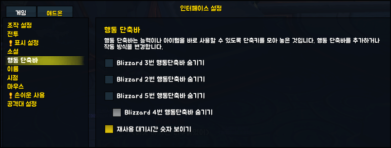 A. esc-인터페이스 설정-게임-행동단축바에 보시면 'Blizzard O번 행동단축바 숨기기' 체크되어있다면 체크해제해보세요
