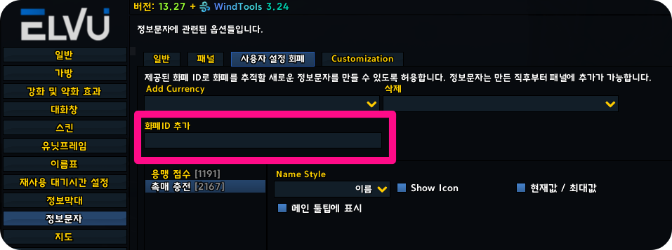 ElvUI > 정보문자 > 사용자 설정 화폐 > 2167 입력