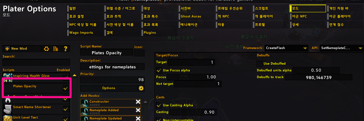 통합애드온에 포함된 Plater 사용 중 몹 이름표의 투명도 관련 옵션입니다.