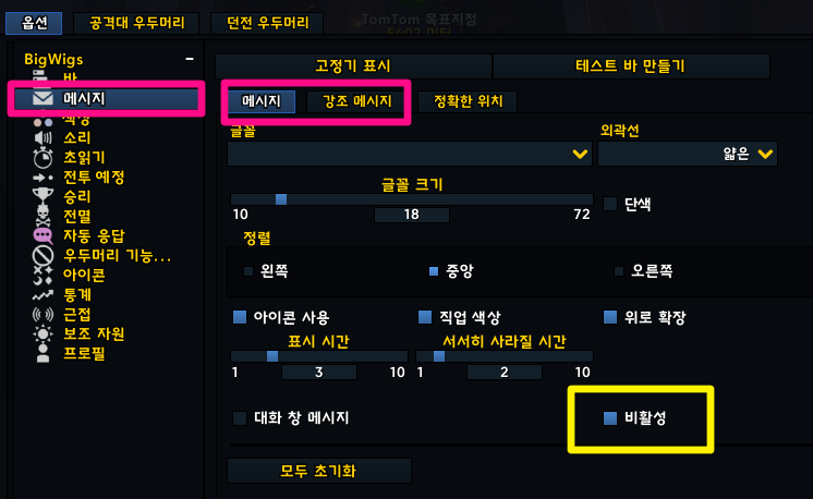 메세지를 보거나 숨기고 싶을 때 빅윅 옵션에서 비활성 체크하거나 해제하세요