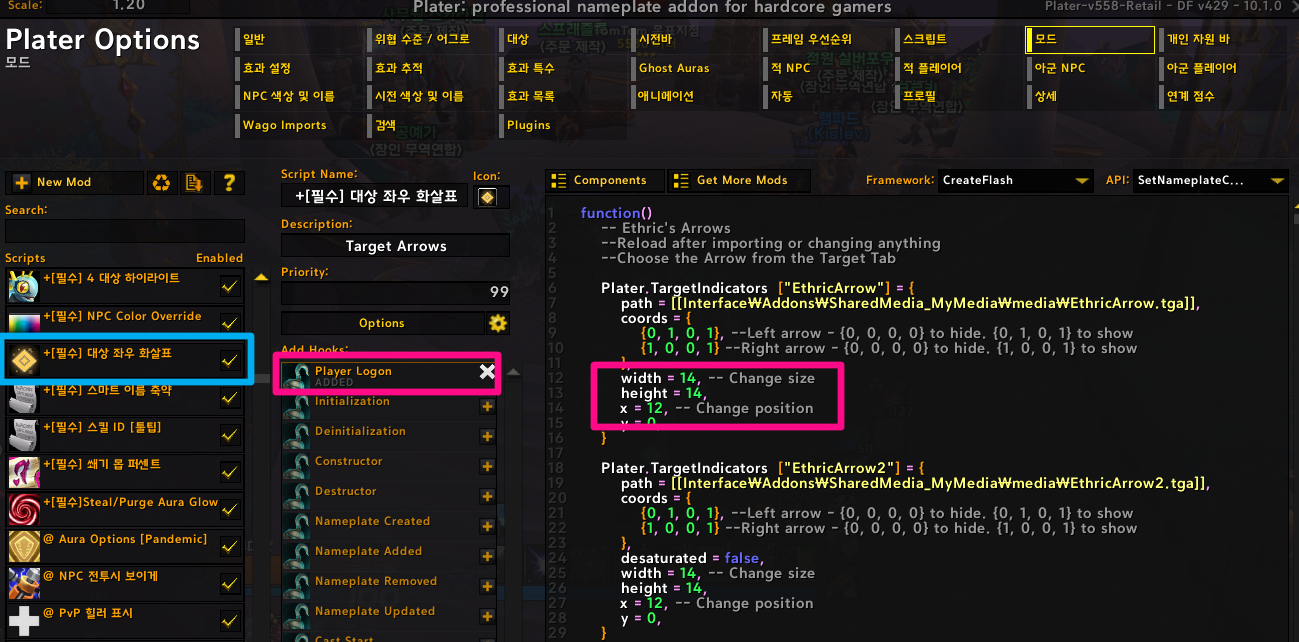 제가 공유하는 Plater의 이름표 좌우에 표시되는 화살표 크기를 수정하는 방법입니다.