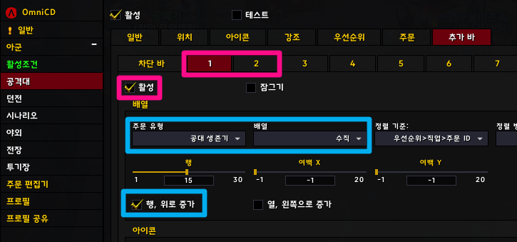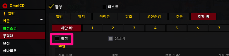 이번에 추가된 활성조건 탭에서 공격대에서 사용하지 않으려면 공격대 체크해제하세요
