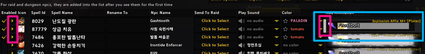 Play Sound에 사운드 효과음을 설정하면 시전 시 효과음이 출력됩니다. - 시전바가 설정된 경우 왼쪽에 ▶ 표시와 함께 오른쪽 시전바에 회색으로 표시됩니다 (분홍색 박스 표시 부분)