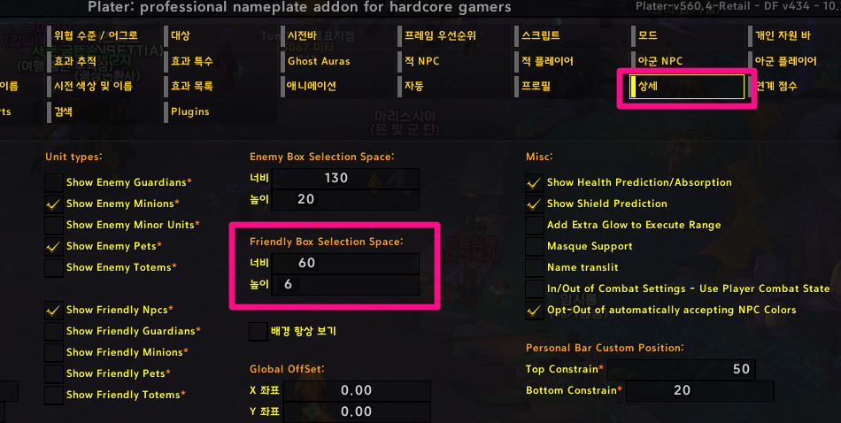이름표의 선택영역 크기 조절은 Plater > 상세 > 아래 옵션에서 가로/세로 선택영역 크기를 변경할 수 있습니다.