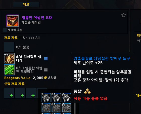 원하는 아이템을 클릭하면 재료들이 보입니다.