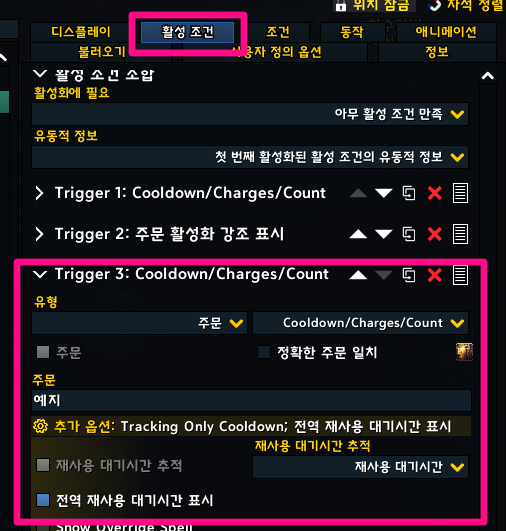 해당하는 활성조건(Trigger) 남은시간을 조건으로 소리 등 옵션을 추가하세요.