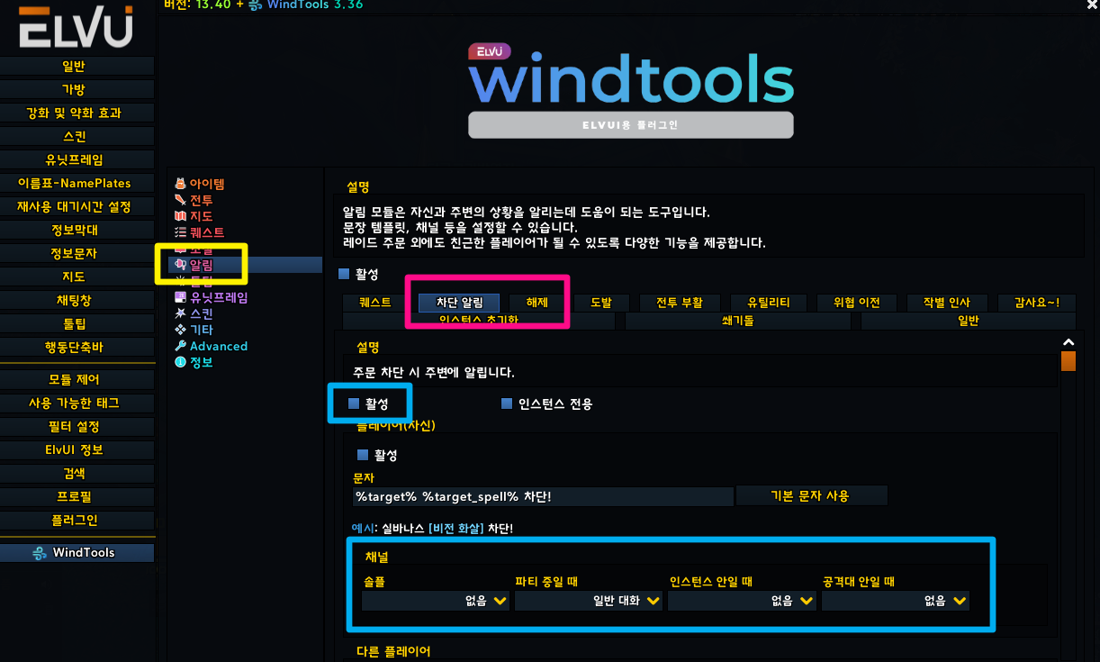 윈드툴을 사용한다면 알림 탭에서 전체를 해제하거나 채널별로 설정할 수 있어요.