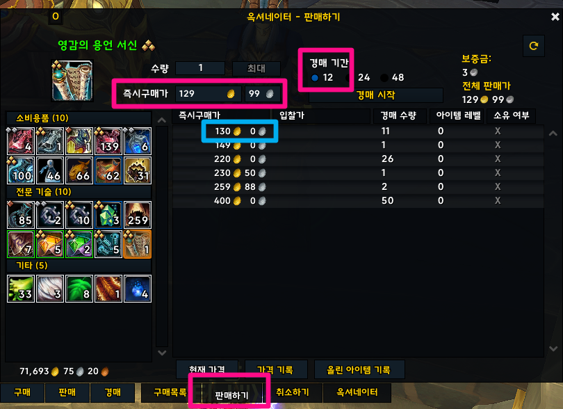 왼쪽 판매 리스트에서 아이템을 선택 한 후 단축키 스페이스바를 누르면 경매시작 버튼이 클릭됩니다.