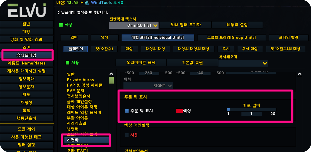 ElvUI > 유닛프레임 > 개별 프레임 > 플레이어 > 시전바 옵션에서 주문 틱 표시를 체크