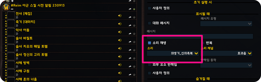 파티, 공격대 일 때 아군이 주요 스킬을 시전하면 사운드로 알려주는 위크오라입니다.