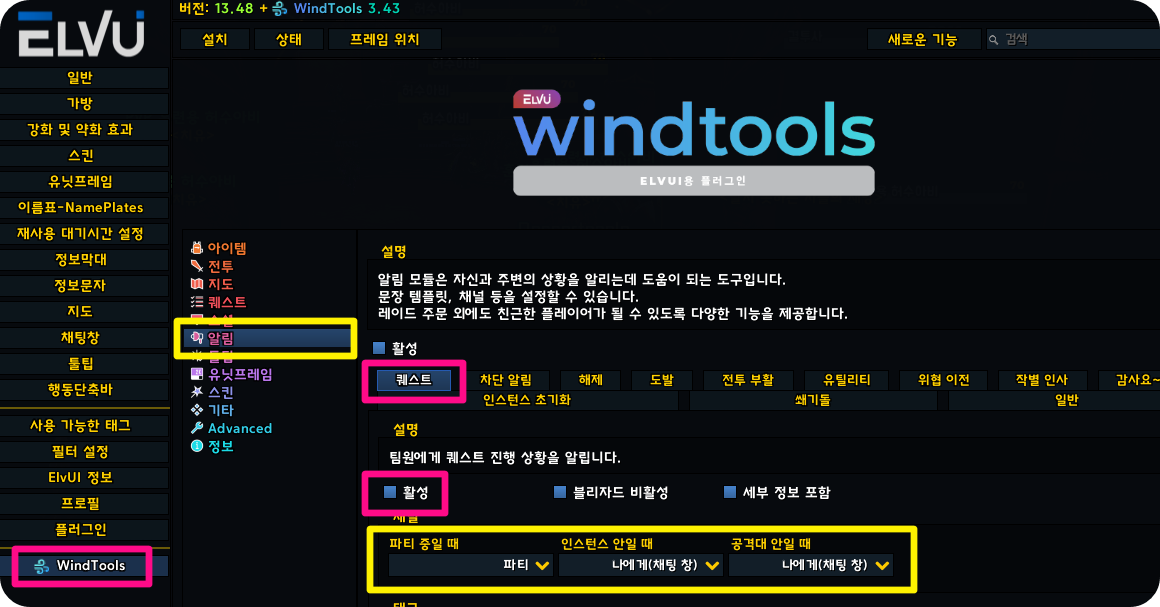 - 엘브 > 윈드툴 > 알림 > 퀘스트 자체를 비활성