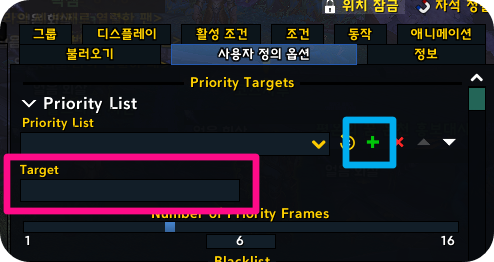 [사용자 정의 옵션]에서 파티원 중 우선순위를 Target 란에 입력하면 하단부터 우선 순위 캐릭명이 정렬됩니다.