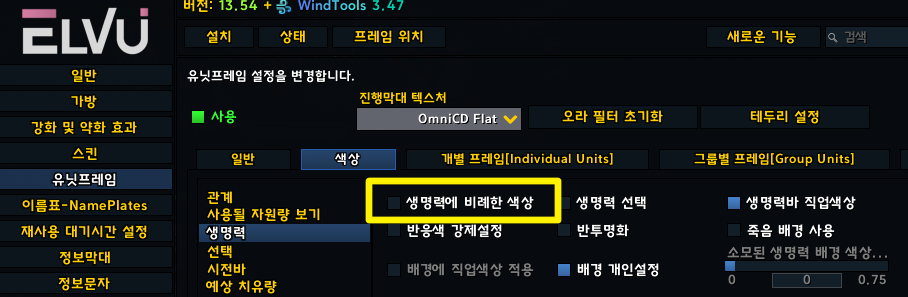 유닛프레임 > 그룹별 > 파티 > 생명력 > 색상 설정