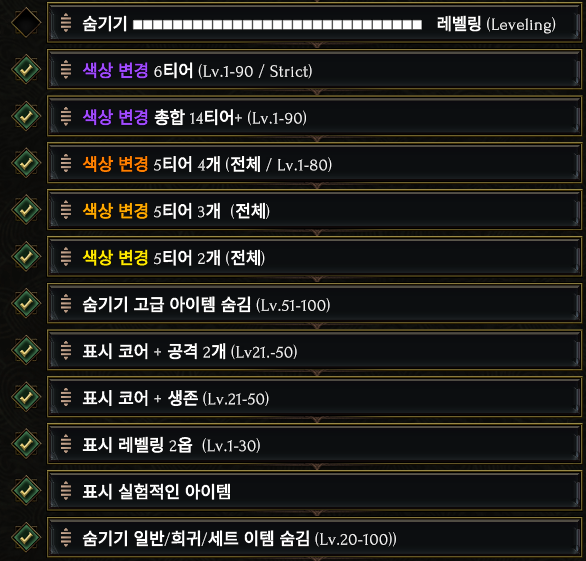 - 레벨링 구간은 중요 옵션 위주로 아이템이 보이도록 설정되어 있습니다.