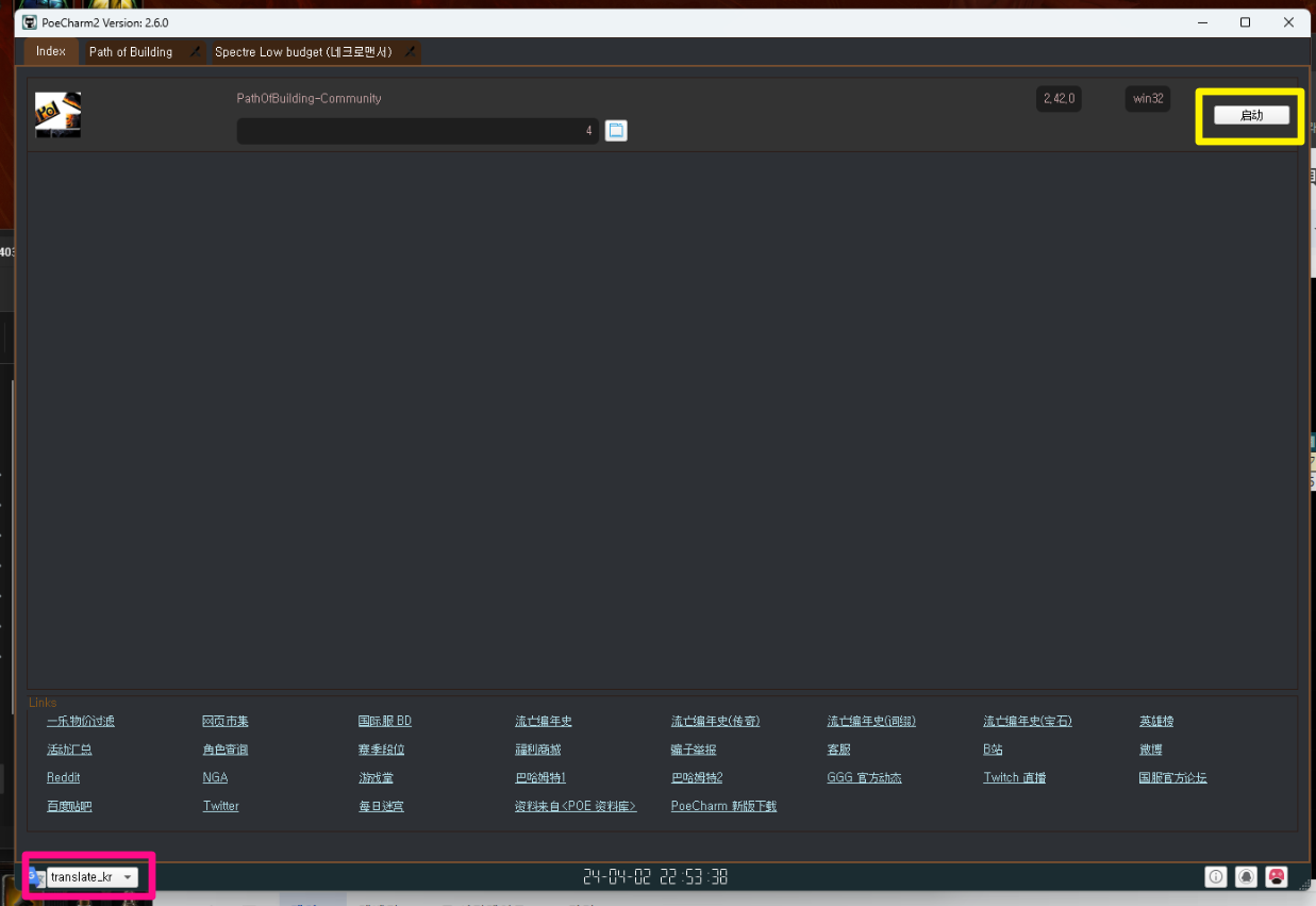 2. 왼쪽 아래 translate_kr 확인하고, 오른쪽 위에 버튼을 클릭하면 POB가 실행됩니다.