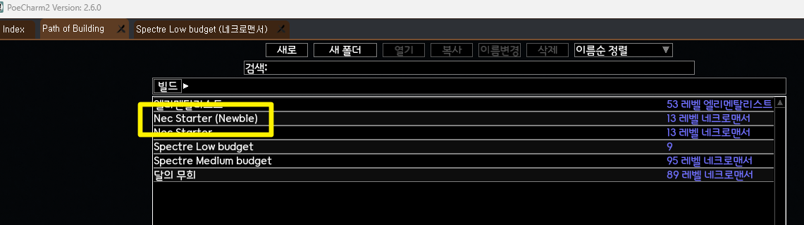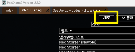 4. 빌드를 새로 가져왔다면 POB를 종료하기전에 상단의 저장 버튼을 눌러서 이름을 지정해주고 저장해야합니다.