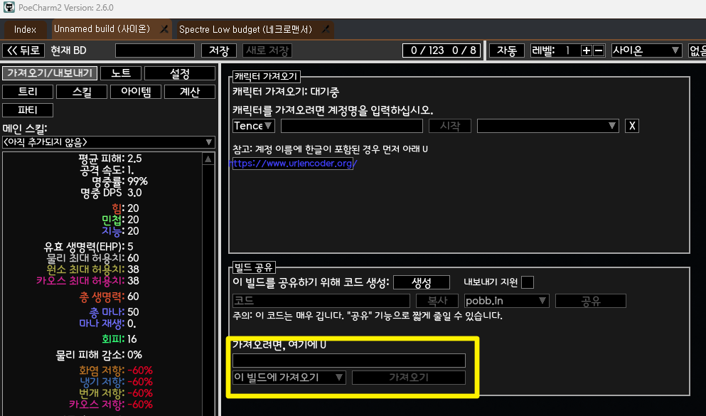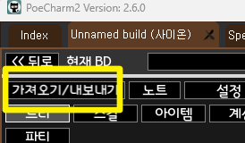 3. 오른쪽 아래 "빌드 공유 - 가져오려면"에 pob 주소를 붙여넣고 가져오기 버튼 클릭